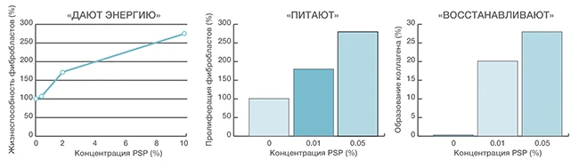 Косметические средства с PSP питают и увлажняют возрастную кожу, восстанавливают ее после воздействия внешних факторов, таких как ультрафиолетовое излучение, загрязненный или сухой воздух, а также насыщают ее энергией.
