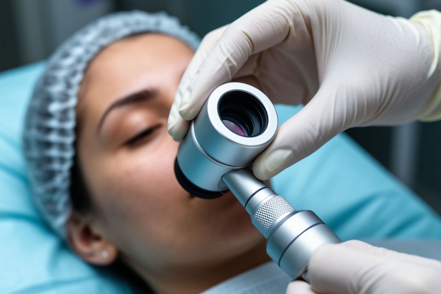 Дерматоскопия является неинвазивной методикой для оценки морфологических особенностей кожных поражений. Используется для диагностики рака кожи, себорейного кератоза, солнечного лентиго, невусов, меланомы. Дерматоскоп оценивает уровень пигментированности кожи, ее структурный рисунок, границы поражения и симметрию. Дерматоскоп также применяется для оценки состояния кожи при акне.
