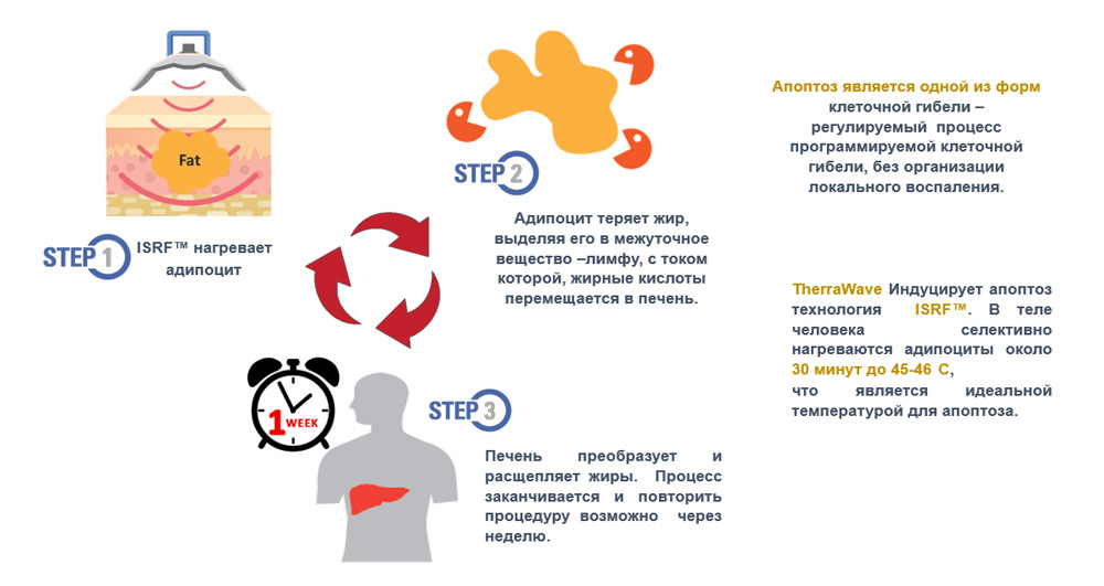 Новейшая технология ISRF подачи энергии дистанционно, но избирательно в подкожно-жировую клетчатку, она нагревает адипоциты до температуры 45–46 °С, создавая оптимальные условия для запуска апоптоза. При этом температура на поверхности кожи не превышает 42 °С.