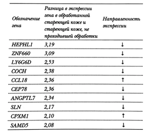 В нем также говорится о том, что процедуры с применением широкополосного света BBL способны изменять экспрессию генов, ассоциированных со старением кожи. Воздействие, оказываемое на кожу, помогает изменить экспрессию генов стареющей кожи (табл. 1), делая ее сходной по ключевым параметрам с экспрессией молодой кожи. Исследование подтверждает гипотезу о том, что с помощью BBL технологии можно воздействовать на регуляторы скорости старения кожи человека для получения не только видимого изменения поверхности кожи, но и изменений скорее функциональных, нежели косметических, обеспечивая сохранение и увеличение ресурса тканей, оказывая онкопротекторное действие.