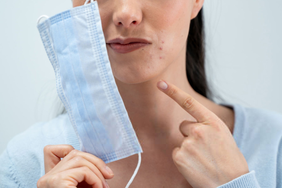 Из-за трения маски, повышенной температуры и пота под маской происходит повреждение кожного барьера, раздражение, присоединение патогенной микрофлоры и развитие воспаления. В результате клинически наблюдаются эритема, папулы и пустулы, усиливается чувствительность кожи и в некоторых случаях появляется зуд (рис. 1 а, б).