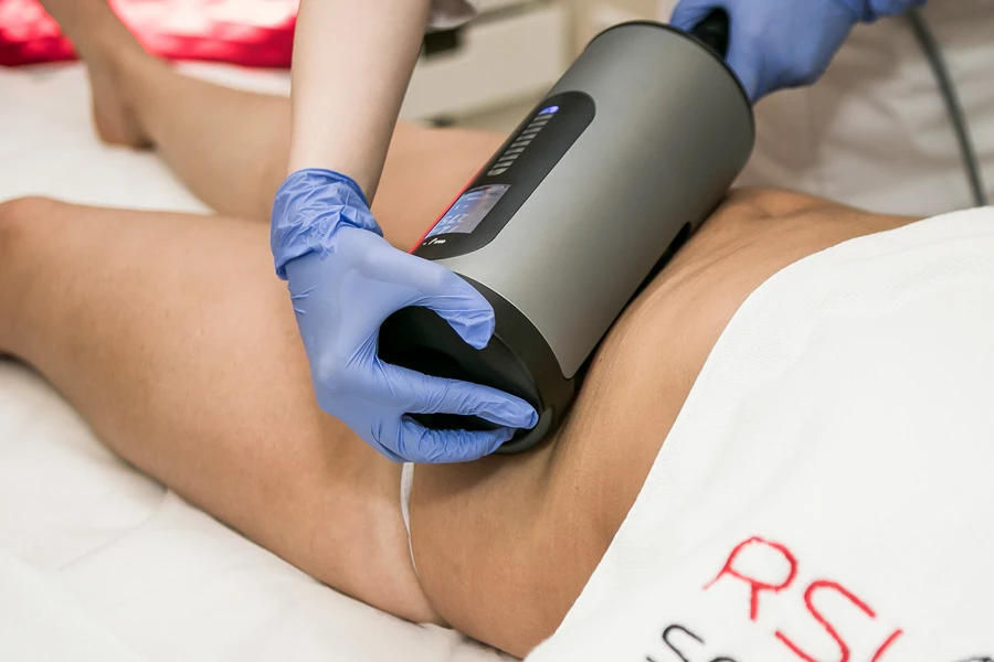Пациентку помещали на кушетку таким образом, чтобы звуковые волны шли перпендикулярно к кожным покровам в зоне воздействия. На зону воздействия и аппликатор аппарата наносился контактный гель, а затем аппликатор плотно приставлялся к зоне воздействия, после чего проводилась обработка с параметрами 2000 ударов на зону, равную ладони пациента, с силой давления 3,4 бар и скоростью обработки 12 ГЦ.