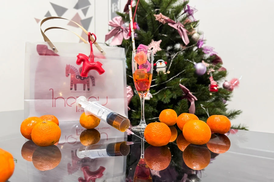 Основой подарка стали мандарины — самый новогодний фрукт. А можно ли использовать мандарин не только по прямому назначению? А вот и да! Кожура может стать прекрасным шуточным пособием по постановке руки на вечеринке, а сам фрукт — основой и контейнером для любимого напитка. Поэтому в дополнение к мандаринам мы включили в подарок коньяк и шприц. А новогоднее настроение создали с помощью светодиодной гирлянды и чудесной красной лошадки с логотипом 1nep.ru (2026-й — год Лошади по китайскому календарю).