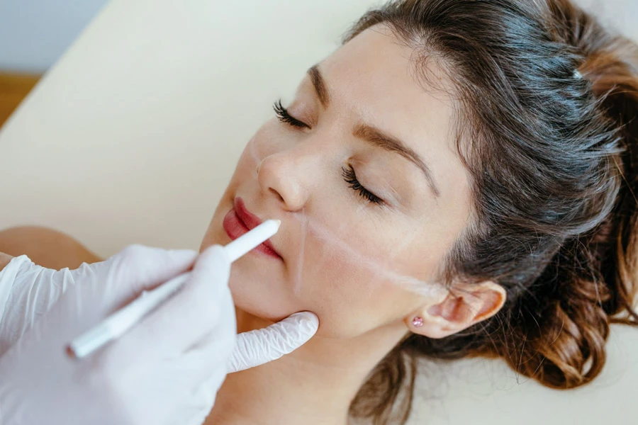 Перед введением препарата следует проводить разметку для детализации особенностей анатомического строения данной области у пациента. Во время разметки отмечаем костный край орбиты, грыжевые пакеты и малярные мешки, если они имеются, а также сами борозды и точки доступа. Важно соблюдать четкие границы для введения препарата той или иной плотности и глубину введения каждого препарата, так как кожа периорбитальной зоны намного тоньше, чем на щеке, и в случае введения препарата плотностью 23 мг/мл в носослезную и пальпебромалярную борозды возможно контурирование препарата.