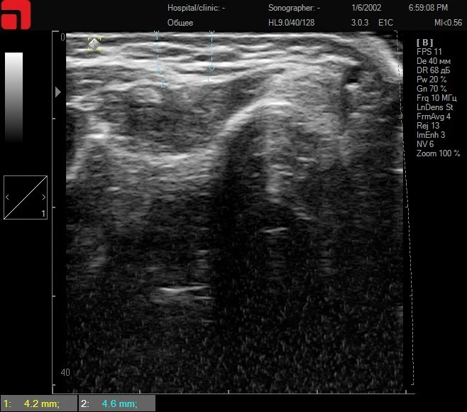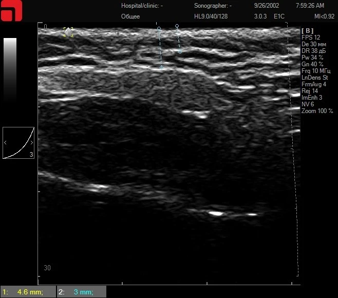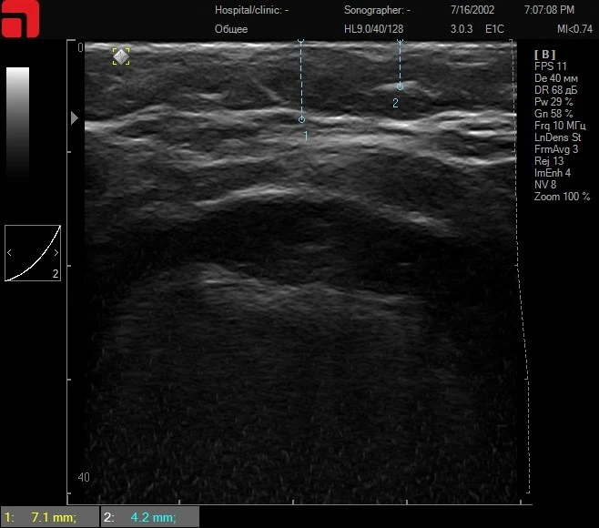 Ключевым фактором в определении оптимального пациента является проведение ультразвуковой диагностики кожи высокого разрешения, так как она позволяет выделить пациентов с большим содержанием соединительной ткани в подкожно-жировой клетчатке и на СМАС-слое (здесь и далее все ультразвуковые сканограммы сделаны на аппарате Doublo).