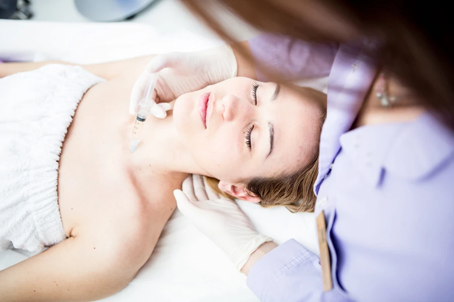 Описание возрастных изменений: локальные жировые отложения в подчелюстной области. Нарушение тургора кожи шеи, проявление дряблости, появление мелких морщин в центральной зоне шеи и горизонтальных морщин шеи.
