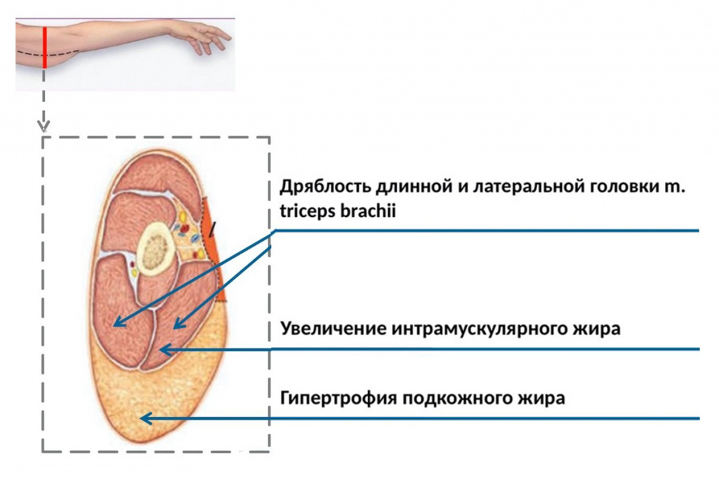 Возрастные изменения: кожа передней поверхности бедра и области коленного сустава с выраженными локальными жировыми отложениями, проявлениями целлюлита и ухудшением тургора.
