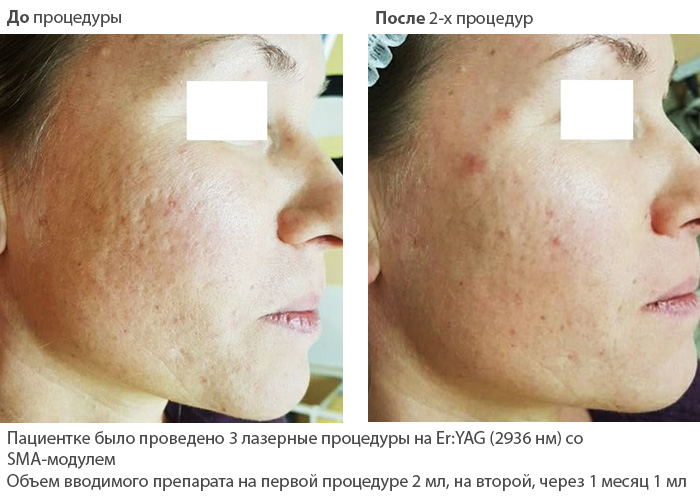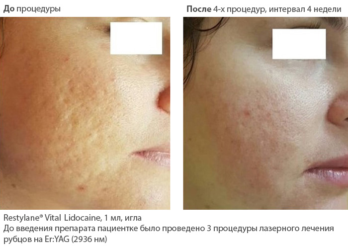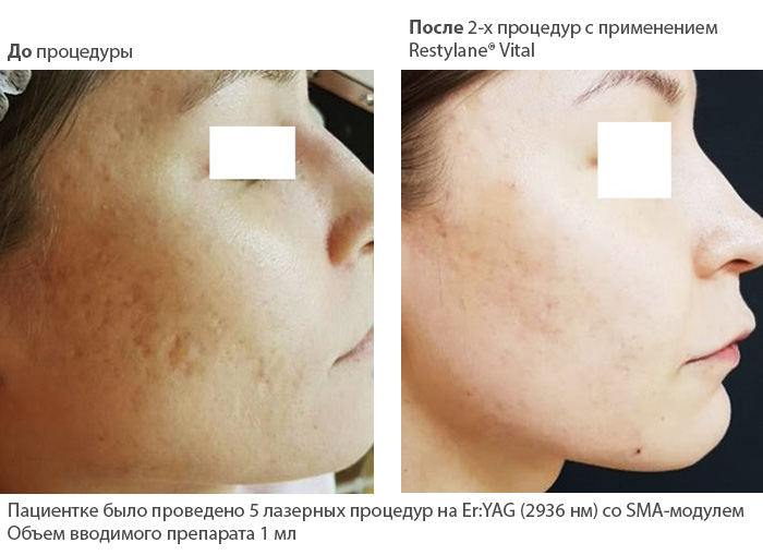 В своей практике мы предпочитаем вводить препарат в объеме 2 мл техникой микропроколов, повторяем процедуру через 1 месяц с использованием уже 1 мл препарата. Коррекцию глубоких атрофических рубцов постакне с применением Restylane® Vital рекомендуем после 2–5 лазерных процедур для получения немедленного видимого результата, дальнейшего улучшения внешнего вида кожи лица на фоне имеющегося психологического дискомфорта у пациентов при отсутствии возможных побочных эффектов при применении фракционного лазера.