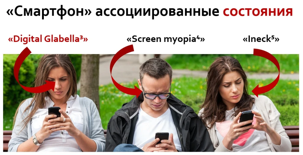 Digital glabella (ил. 2) – так я называю у своих молодых пациентов младше 30 лет хроническое напряжение глабеллы из-за концентрации внимания, необходимости всматриваться в маленький светящийся экран. Ведь именно они сегодня проводят больше всего времени в смартфонах, зачастую страдая настоящей гаджетоманией, и связанными с этим другими состояниями, уже давно описанными коллегами: