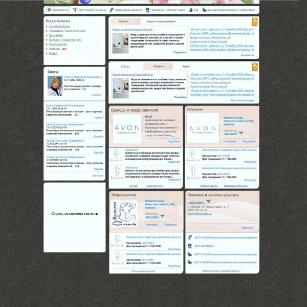 Что было сделано: 1. Flash версия главной страницы. Конечно красиво, однако не совсем вписывается в концепцию нашего сайта. Поэтому оставим данный элемент для англоязычной версии сайта. 2. Были разделены бренды и представители внутри раздела. Цель изменения - добавить интерактивности, сделать 2 взаимосвязанных каталога и юзер без всякой путаницы сможет получить нужную информацию. 3. Теперь любой элемент в базе данных может иметь подробную справку. Тот же Представитель может очень подробно описать свою организацию, а также разместить информацию о своих брендах. Пример 4. RSS (новости, статьи, мероприятия) 5. Изменен дизайн и содержание 2-х тройных блоков на главной странице. 6. Появились блоги 7. Появились первые элементы социальной сети: написать сообщение, добавить юзера в друзья, написать статью, добавить статью в избранное 8. Появился личный календарь 9. Появился раздел "Профессиональные конкурсы". 10. Разработана концепция главной страницы раздела