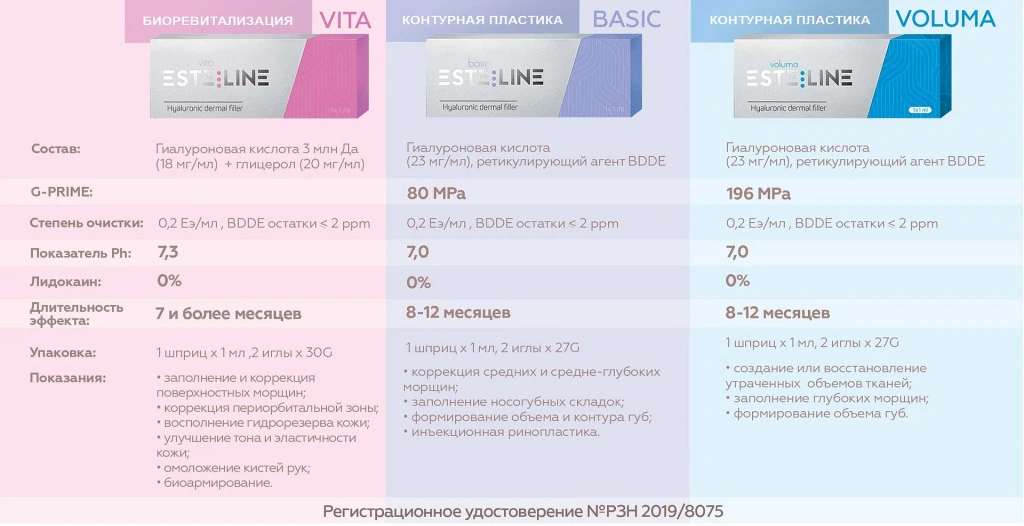 В линейке Esteline присутствуют 3 препарата, различные по концентрации гиалуроновой кислоты и, соответственно, эффекту от применения: