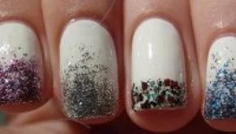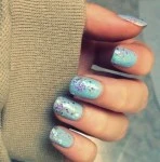Этот вариант – нечто среднее между французским маникюром и покрытием блестками. Лак с блестками нужно нанести не на всю поверхность ногтя, а только от середины к кончику.