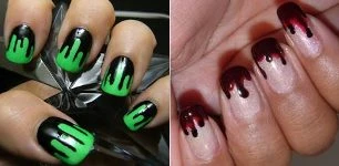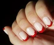 Это вариации на тему французского маникюра. Новый лак на кончики ногтей наносим не ровными полосками, а рисуем еще капельки лака, как бы стекающие к основанию ногтя.