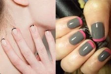 Также удалив старый лак с кончиков ногтей, рисуем на них аккуратные полоски контрастного оттенка.