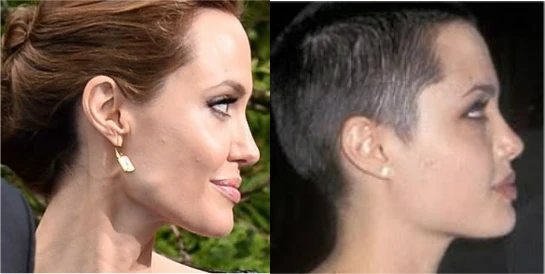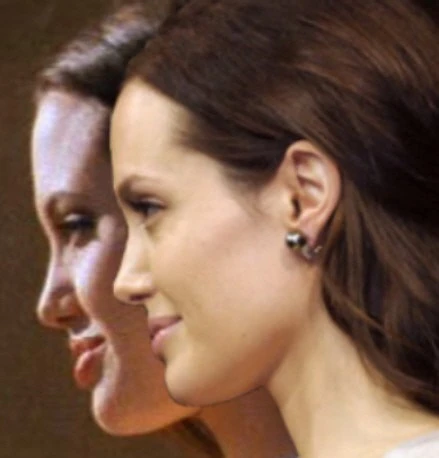 На этой фотографии Анджелина Джоли в 1993 (на заднем плане) и в 2009 (на переднем плане). Кончик носа заметно изменил направление - очевидный результат .